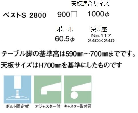 ベストS2800 ショットクローム塗装パイプ 適合天板サイズ900角、1000φ